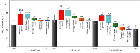 图 1. 2002–2017年间中国PM2.5暴露的长期变化趋势及主要驱动因素