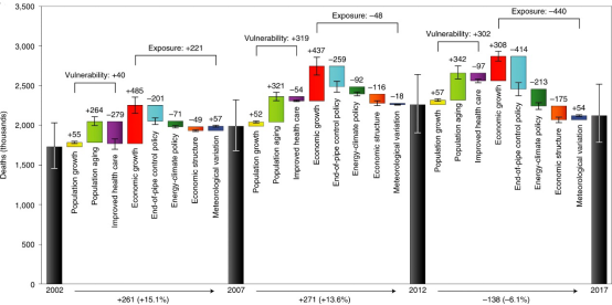 研究发现,2002–2017年间,经济快速增长导致的化石能源消费激增以及人口总量增长和老龄化程度加剧是致使健康风险增加的最主要因素,分别使PM2.5相关过早死亡风险增加123万人/年和109万人/年;推进污染末端治理、能源结构转型和经济结构优化、医疗条件改善分别避免了87万人/年、72万人/年、43万人/年的过早死亡风险,是减少人群相关健康风险的最重要因素。2012–2017年间,随着《大气污染防治行动计划》(“大气十条”)的实施,污染末端治理和能源结构转型措施力度显著加强,推动中国PM2.5污染水平和健康风险出现下降拐点。
