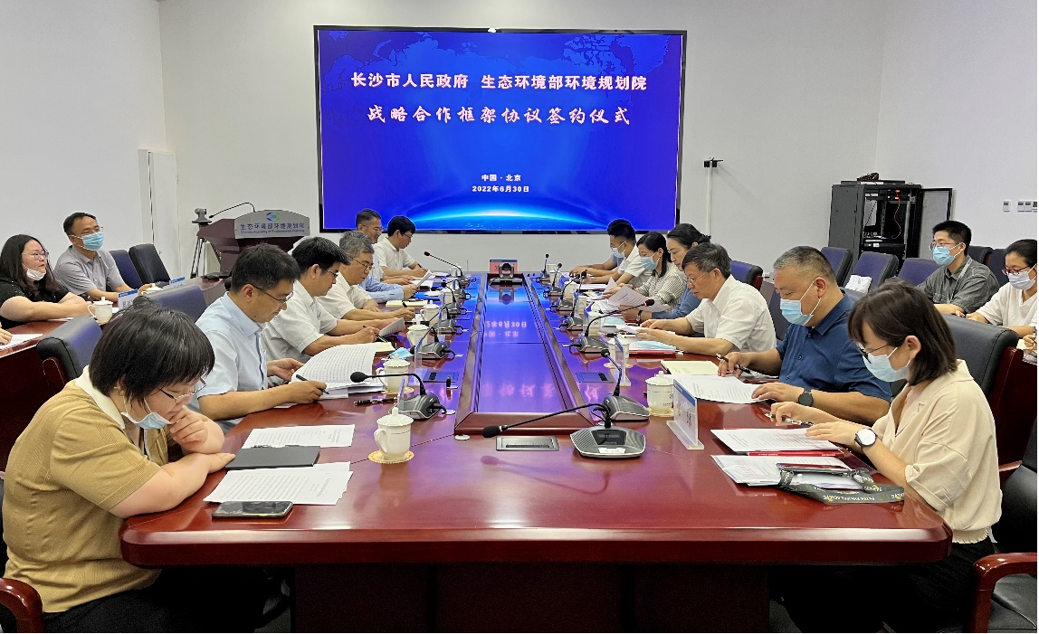 2022年6月30日,环境规划院与长沙市人民政府签署生态环境保护工作战略合作框架协议。我院陆军书记、王金南院长、万军总工、严刚副院长、各部门代表,长沙市人民政府刘汇副市长,长沙市生态环境局潘胜强局长、赵玲芳副局长等相关负责同志出席签约仪式。