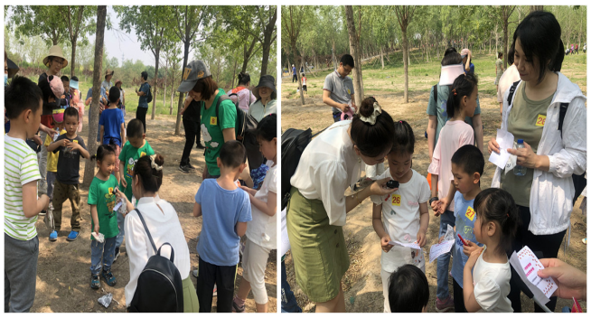 人与自然和谐共生,动植物都是我们的好朋友,接下来的寻找动植物“好朋友”活动同样备受欢迎。大家以家庭为单位,寻找藏身于树林、草丛中小动物模型和环保知识小锦囊,并和植物拍照打卡,这项活动使孩子们对植物、动物有了更多的感官认识。5月22日恰逢第27个国际生物多样性日,通过阅读锦囊内的生物多样性小知识,也使孩子们对生物多样性保护有了初步认识。