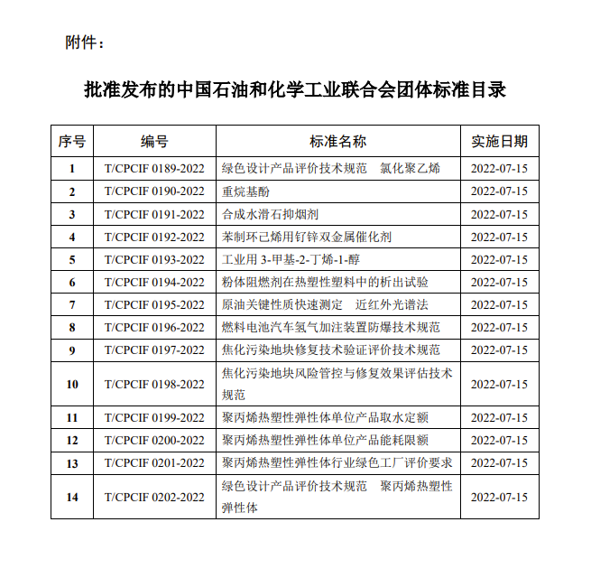 2022年4月14日,中国石油和化学工业联合会发布公告2022年第02号,正式批准《焦化污染地块修复技术验证评价技术规范(T/CPCIF 0197-2022)》《焦化污染地块风险管控与修复效果评估技术规范(T/CPCIF 0198-2022)》两项团体标准发布实施。