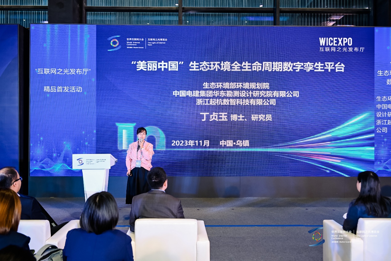 11月8日,在2023年世界互联网大会乌镇峰会的“互联网之光”博览会现场,生态环境部环境规划院联合中国电建集团华东勘测设计研究院有限公司、浙江起杭数智科技有限公司重磅发布“美丽中国”生态环境全生命周期数字孪生平台,该成果全面贯彻落实全国生态环保大会要求,深化生态环境领域数字技术应用,构建美丽中国数字化治理体系,建设绿色智慧的数字生态文明。生态环境工程咨询中心丁贞玉研究员代表开发团队在首发活动中对该平台进行了全面系统的推介交流。