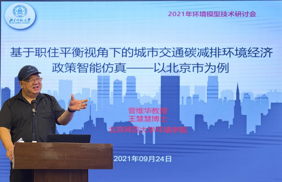 曾维华教授从职住平衡的视角出发,以北京市为案例介绍了城市交通碳减排环境经济政策的智能仿真模拟,他分析了北京市职住关系及交通拥堵现状,并构建了北京市交通碳减排环境经济政策智能仿真模型,基于ABM+SD模型实现了北京市交通碳减排环境经济政策多情景调控方案模拟,给出了各经济政策的定价和优选方案组合,为相关经济政策的制定提供了参考和依据。