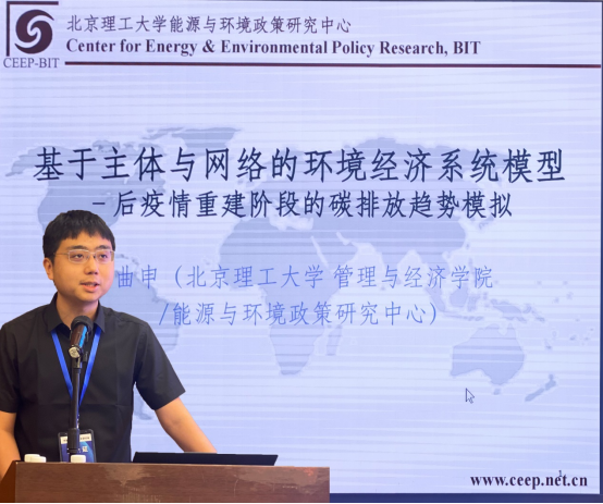 曲申教授结合后疫情重建阶段的碳排放趋势模拟,介绍了自主开发的基于主体与网络的环境经济系统模型(CLUES),分享了模型的设计原则、时空精度以及创新点,并结合当前双循环背景模拟环境系统与中国及世界经济系统的耦合,定量分析了未来不同情景下中国碳排放趋势以及财政刺激政策对中国碳排放的影响,进而提出了发展绿色产业、助力中国经济系统绿色转型的相关政策建议。
