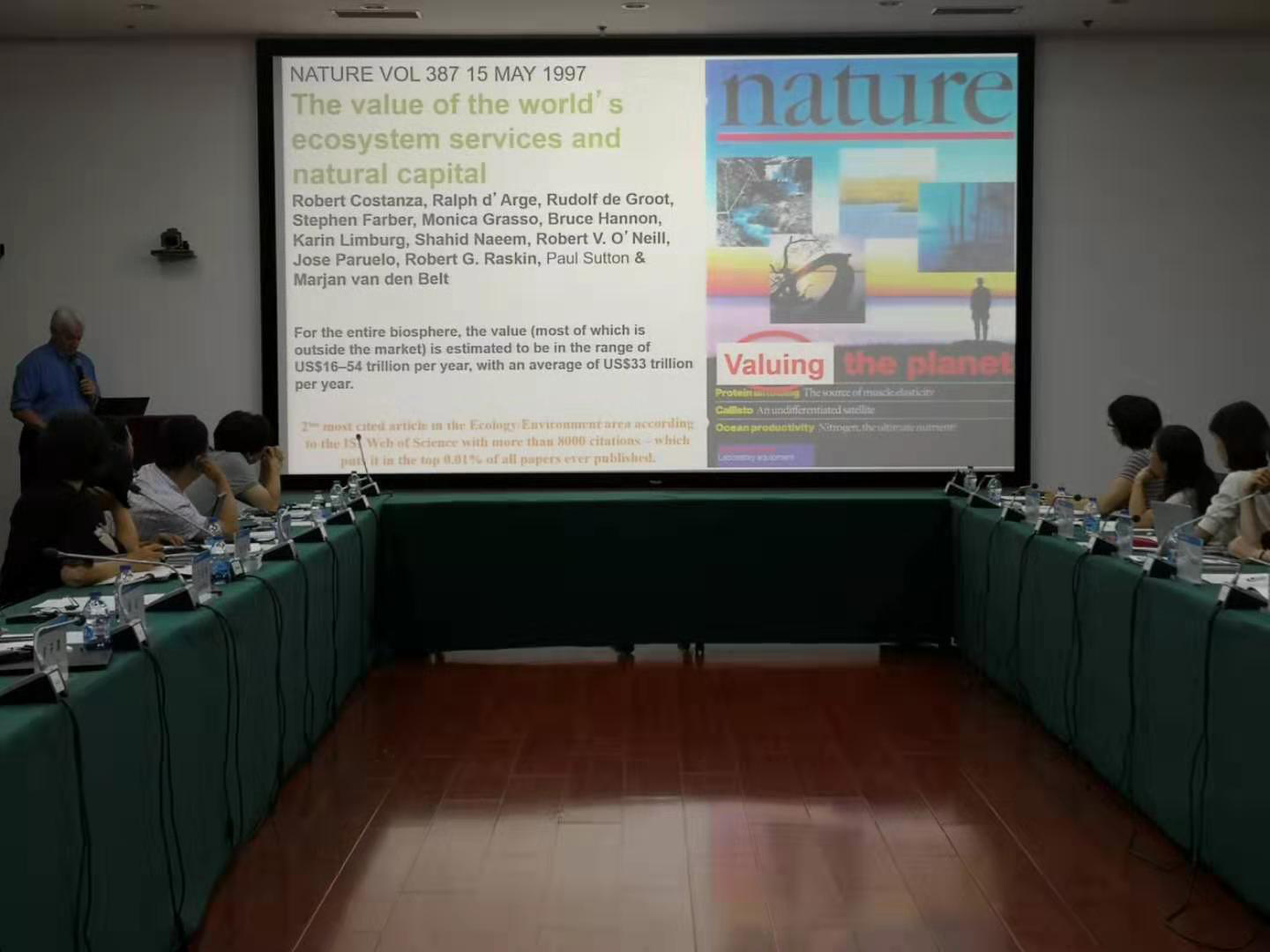 王金南院长对Constanza教授一行的到来表示欢迎,简要介绍了环境规划院的概况以及持续开展绿色GDP研究的背景和历程。马国霞研究员介绍了绿色GDP研究最新成果-经济生态生产总值(GEEP)核算。Robert Costanza教授对我院绿色GDP核算持续多年的坚持给予高度评价,希望规划院继续从绿色GDP的动态变化和未来趋势模拟方面,不断升级核算版本。Robert Costanza教授进行了生态系统服务价值评估的主题演讲,系统阐述了生态系统服务价值核算的主要目的、核算方法和潜在应用领域,并通过美国新奥尔良保护海岸湿地避免飓风灾害价值的研究、大熊猫保护价值以及不同土地利用情景的生态系统服务价值评估等具体案例,说明生态系统价值核算的目的不是生态资产的货币化,而是通过货币化改变和影响人们或政府关于生态资源的行为和决策。会议由我院生态环境经济核算中心主任於方研究员主持。