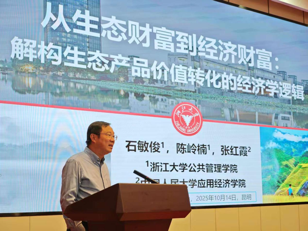 浙江大学石敏俊教授作了题为《从生态财富到经济财富》的主旨报告。他指出,生态产品价值实现是习近平生态文明思想的关键领域和关键路径,国家政策明确提出2025年有效破解“度量难、交易难、变现难、抵押难”问题,但目前实践进展有限且理论支撑不足。首先,当前学界对生态产品认知存在分歧,且过去基于生态学逻辑的评估,难以支撑其价值转化,存在定价难、价值贡献测算不准等问题。引入“生态租金”概念,将生态资源作为核心投入要素,界定其在生态产业中的价值贡献,以此构建价值转化框架。此外,创新性界定生态产业范围,研究发现生态财富对经济增长贡献呈增长趋势,但整体转化程度仍较低。最后,他提出研究仍在深化推进,期待同行提出宝贵建议,为政策实践提供支撑。