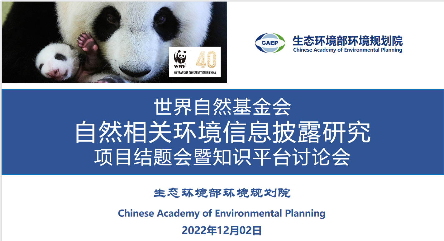 2022年12月2日,由世界自然基金会(瑞士)北京代表处(以下简称“WWF”)支持、生态环境部环境规划院承担的“绿色金融暨自然相关环境信息披露研究”项目结题会暨知识平台讨论会在北京顺利召开。会议由我院管理政策所副所长董战峰主持,WWF政策倡导项目主任赵亮、绿色金融项目高级经理杜红霞、可持续食物消费与绿色供应链项目主任于蔚致辞发言。来自中国银行业协会、全球环境信息研究中心(CDP)、北京林业大学、北京绿色金融与可持续发展研究院、中国林业科学研究院等机构的知名专家,以及WWF代表、项目技术骨干等参加了此次会议。