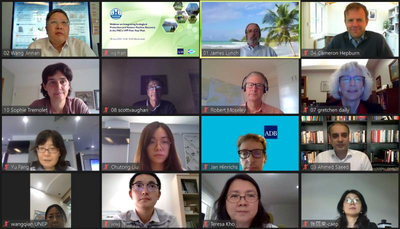 出席此次研讨会的嘉宾有国合会秘书处、生态环境部环境规划院、中科院生态环境研究中心、中国农业大学、中国金融学会绿色金融专委会、阿里巴巴集团、亚行、经济合作与发展组织(OECD)、牛津大学、斯坦福大学、大自然保护协会等中外机构专家共40余人。会议由亚行东亚局局长詹姆斯·林奇(James Lynch)主持,与会代表围绕如何将自然资本投资纳入“十四五”规划,推动中国及亚太地区实现可持续发展这一议题展开深入探讨。