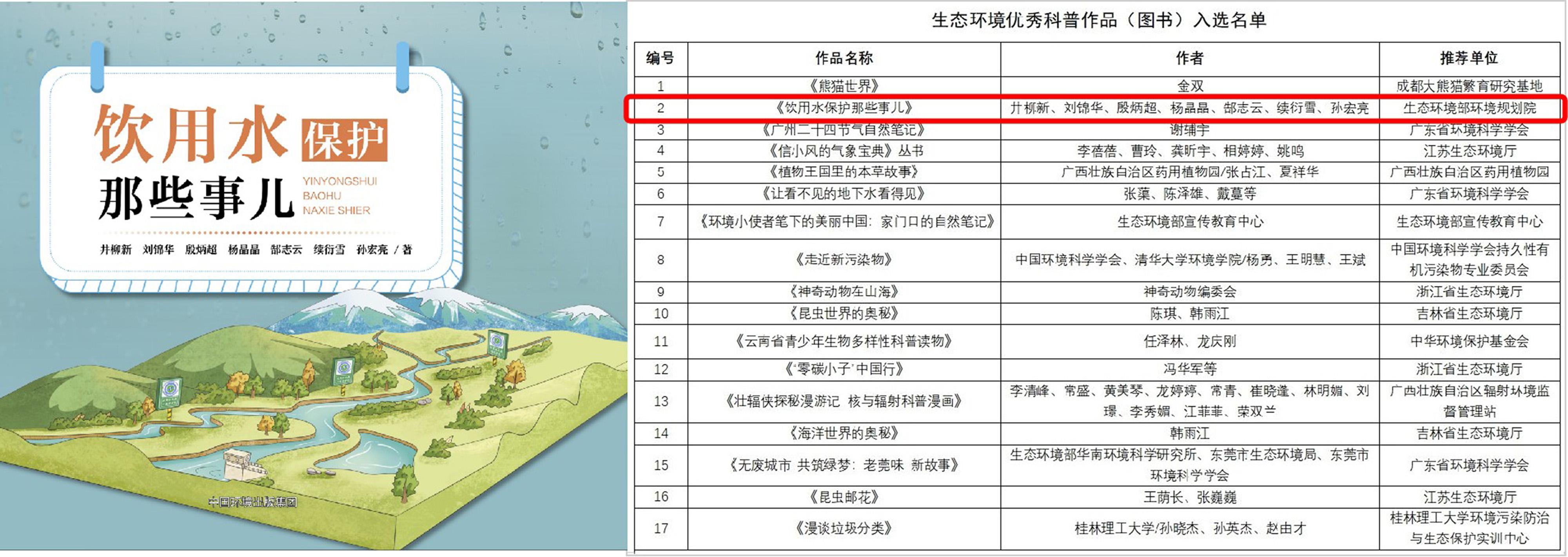 为发挥科普对科技成果转化的促进作用,大力推进科技资源科普化,中国环境科学学会组织开展了2025年度“生态环境科技成果科普化典型案例和优秀科普作品征集”活动。经组织推荐、专家评议并公示无异议后,共评选出优秀科技成果科普化典型案例8个、优秀科普图书17部、优秀科普展览6个、优秀科普短视频20部、优秀科普海报10个。我院水生态环境规划研究所《饮用水保护那些事儿》入选生态环境优秀科普作品(图书)。