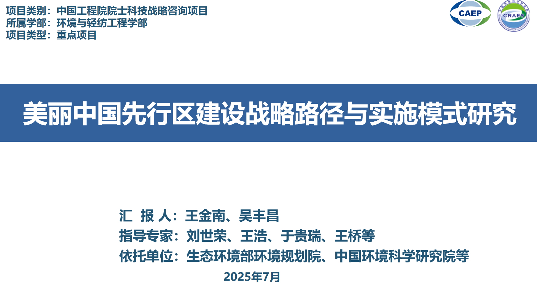 2025年7月25日,由生态环境部环境规划院王金南院士、中国环境科学研究院吴丰昌院士牵头的中国工程院环境与轻纺工程学部重点项目“美丽中国先行区建设战略路径与实施模式研究”启动会在京顺利召开。