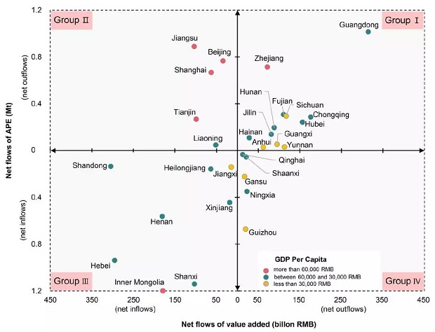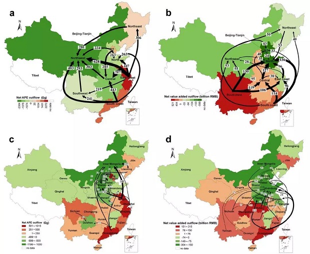 该项成果采用多区域投入产出模型结合大气污染物排放清单,评估了中国省际贸易隐含的大气污染排放转移和经济收益转移,并构建了环境公平指数评估中国产业分工协作中存在的区域环境不公平程度。结论显示:中国各区域和省份在开展区域分工协作和贸易过程中,存在显著的环境不公平现象。沿海发达省份将62%−76%的消费端大气污染转移到其他省份,但是却将70%左右的增加值收益留在了本地。贵州、宁夏、云南等西部欠发达省份在与发达省份开展贸易过程中,不但承担了大气污染的净流入,同时由于处于国内价值链底端,也无法获得经济收益。对上述区域分工协作过程中的环境不公平问题的探讨可以为我国划分区域大气污染治理责任提供参考。