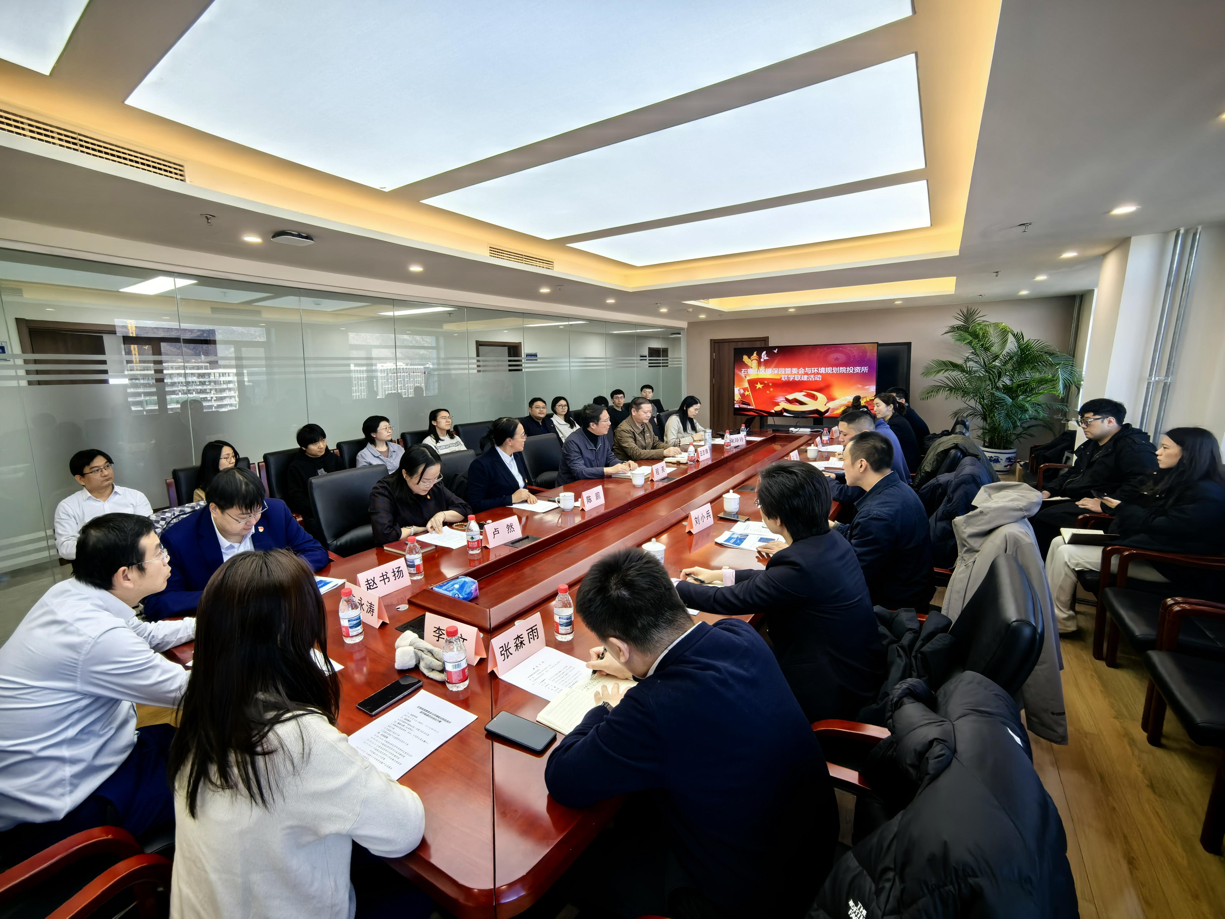2025年12月4日下午,我院与石景山区银行保险产业园区管理委员会共同举办联学联建活动。来自我院投资所、党办、大气所、土壤中心,以及交通银行北京市分行、石景山区银保园管委会等单位的近40名代表参加了本次活动。