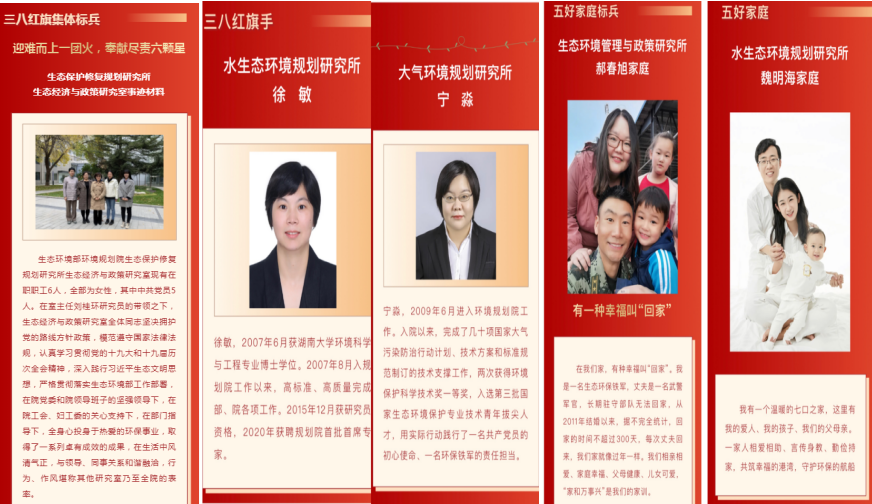 学典型事迹,扬巾帼之志 。院领导们与女职工一起通过视频参会方式,共同参加生态环境部举办的“三八”国际妇女节纪念活动。我院3位个人、1个集体和2个家庭荣获2022年部直属机关先进个人、集体、家庭和妇女工作者等多项荣誉。我院郝春旭同志作为部直属机关五好家庭标兵代表作典型发言。院妇工委随即将我院获得生态环境部直属机关妇工委2020-2021年度表彰的1个先进集体,4个先进个人的典型事迹在全院进行推送宣传。广大女职工纷纷表示,将按照孙金龙书记提出的要求和希望,以榜样为引领,以巾帼不让须眉的拼劲和韧劲,牢记使命、砥砺前行,以更高水平、更高质量做好生态环境决策技术支撑,做伟大事业的建设者,文明风尚的倡导者和敢于追梦的奋斗者。