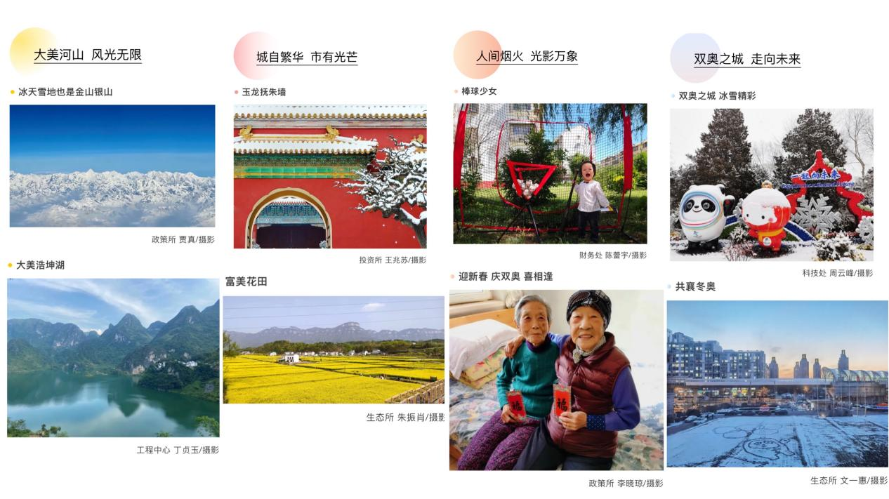 看美丽中国,享美好生活 。院妇工委联合院工会征集了40余幅职工摄影作品,分为“大美河山,风光无限”“城自繁华,市有光芒”“人间烟火,光影万象”“双奥之城,冰雪精彩”四个片段开启了全院职工的视觉盛宴,带领大家一起欣赏天蓝、地绿、水清的大美河山,一起见证人与自然的和谐之美,一起感受双奥之城的冰雪魅力。光影定格美好瞬间,摄影礼赞幸福生活。
