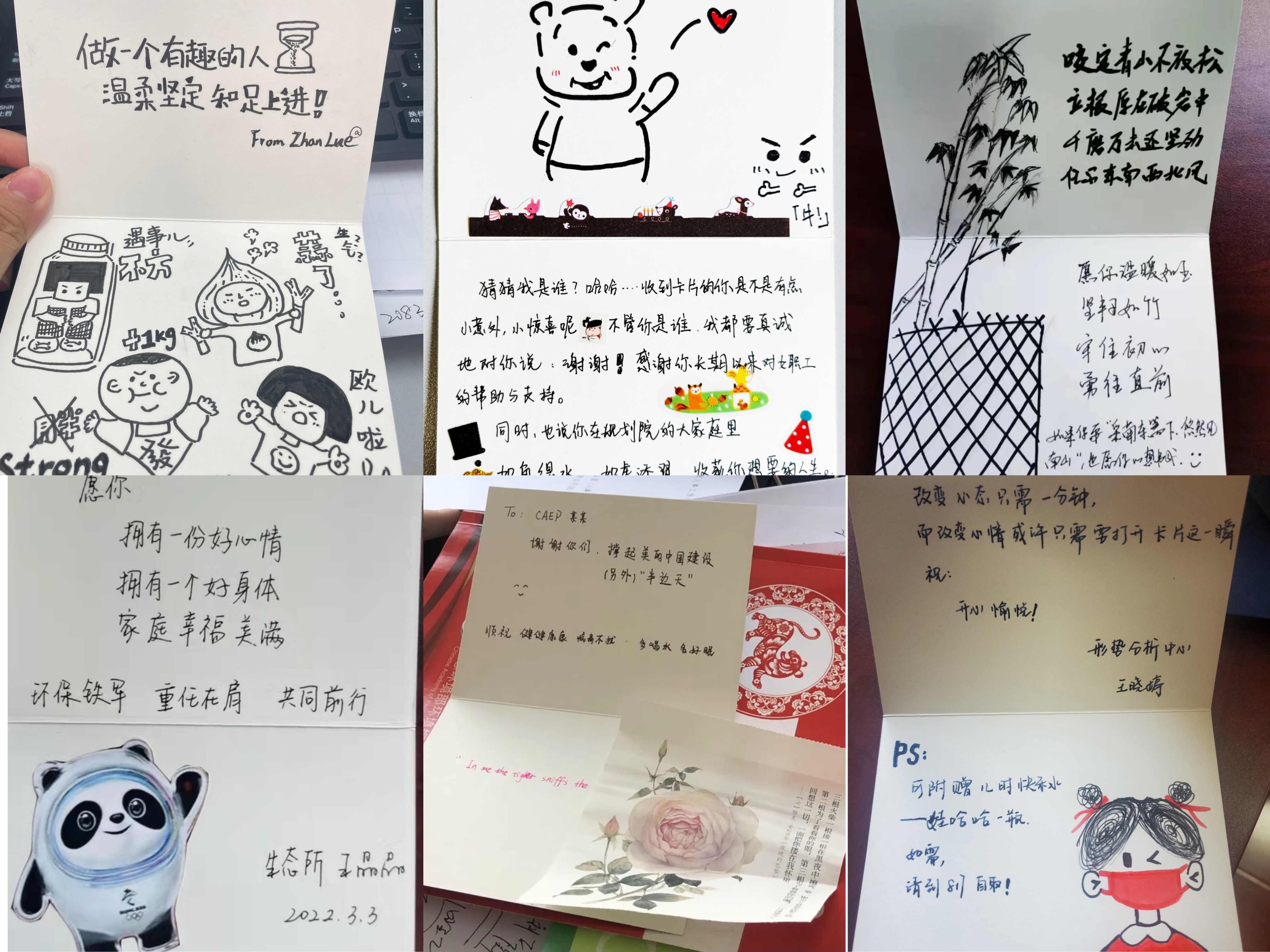 盲盒表暖意,盲卡谢真情 。为营造节日气氛,让女职工们度过一个幸福温馨的节日,院妇工委精心策划了全院职工节日互动活动,组织我院男职工为全院女职工赠送祝福“小心意”,同时,组织女职工秘密书写了159张“盲卡”回馈全院男职工,表达诚挚谢意。手绘冰墩墩,印章冰墩墩等各色冰墩墩精彩亮相,梅兰竹菊、月季、玫瑰、卡通人物也跃然纸上。在送出盲卡的同时,女神们的专属盲盒也惊艳亮相,精致的礼盒中包含着精美的小礼物和男神们送出的神秘“大礼”,“沉鱼落雁是你的表面,闭月羞花是你的内涵”“永远绽放,盛如春华”,男神们的赞美毫不吝啬;《小王子》、纪念币、手编自行车、手叠康乃馨,男神们的礼物充满惊喜;60后、70后、80后、90后男神代表的祝福朴素真挚感人,再加上男神们亲手系上的“蝴蝶结”丝带,又一次让女职工们感动满满,幸福感爆棚。