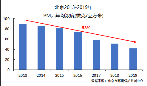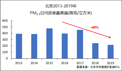 第二个是“雾霾重污染”和“PM2.5年均浓度达标”的概念混淆。我们知道,同样的排放量,碰上气象条件非常不利,PM2.5浓度就会很高;如果气象条件比较有利,PM2.5浓度就会很低。刚刚过去的这几天,我们也经历了PM2.5浓度的过山车,2月13日北京PM2.5浓度还是197微克/立方米,到了2月15日就降到了6微克/立方米,就这两天而言,北京大气容量的差异高达30倍以上。“容量论文”并没有讨论“污染物排放降低到什么程度,我们就不会有重污染”这样的极端情景,而是讨论“给定气象条件和污染源排放分布格局下,污染物排放降低到什么程度,我们的PM2.5浓度能基本达标”这一全年平均的情景。当然,随着全年PM2.5浓度的下降,雾霾重污染的频率、长度和强度都会降低。以北京为例,从2013年到2019年,PM2.5年均浓度从89微克/立方米下降到42微克/立方米,PM2.5日均浓度的最高值也从400微克/立方米左右下降到200微克/立方米左右(见下图),重污染天数从58天减少到4天。我们认为坚持目前的工作方向不动摇,雾霾重污染将进一步减少,直至基本消除。