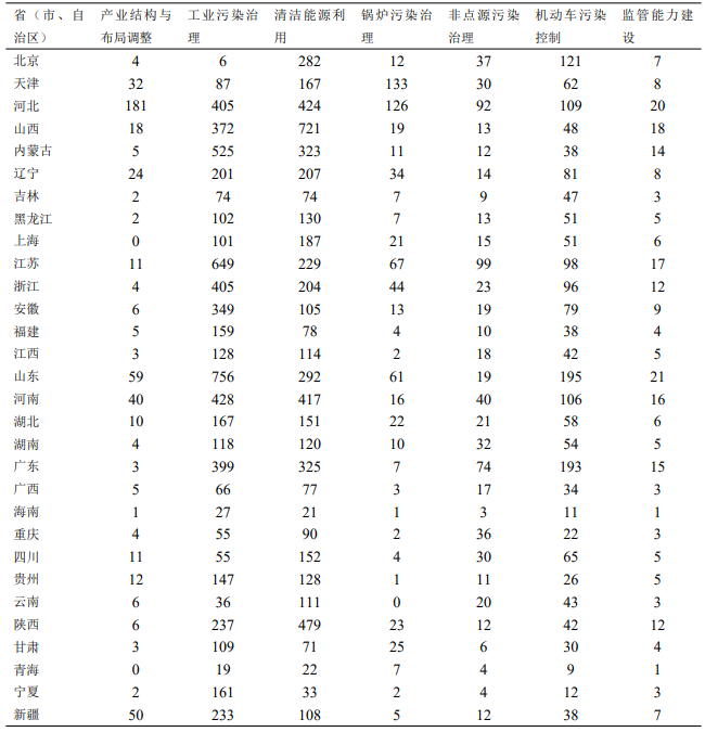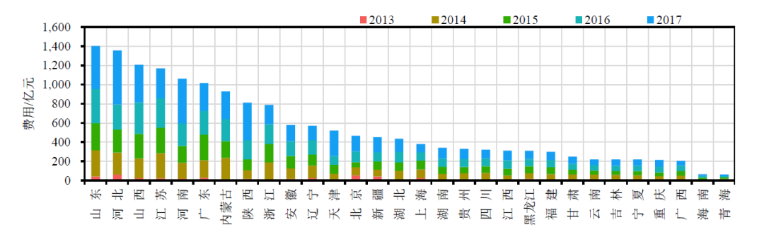 环境监管与科技支撑能力主要包括大气污染防治应急能力建设、大气环境监测网格体系建设、执法监督体系建设(含环保督查、巡查)、科技研发(大气专项、总理基金)等保障支出。由于各措施成本难以统计,故采用经验法,即占大气污染防治行动计划总费用的1.5%作为能力建设投入。以上数据来源于2017年全国30个省份的《大气污染防治行动计划》实施情况自查报告,这些报告是各地方上报到生态环境部的工作报告,西藏地区由于数据缺失较严重,暂不纳入分析范围。
