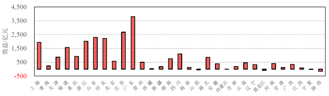 《大气十条》的净效益等于总效益减去总费用(图5)。全国的净效益为8180亿元,即所产生的经济社会效益远大于花费的成本。把30个省份按净效益从高到低排序,广东的净效益最高,达到了2793亿元,远远高于其他省份,长三角地区的上海、江苏、浙江较高,分别达到1553亿元、1509亿元、1228亿元,排在第2、3、5位,福建净效益1270亿元,排在第4位。山东、河北、四川、重庆、湖南、湖北、天津、云南、青海、贵州、广西、北京、海南的净效益均为正值,即效益大于费用也就是《大气十条》的实施所带来的质量改善健康等的总收益是高于各项措施实施的总资金投入,吉林、甘肃、安徽、江西、宁夏、辽宁、新疆、黑龙江、河南、内蒙古、陕西、山西的净效益均为负值,即效益小于费用也就是《大气十条》的实施所带来的质量改善健康等的总收益是低于各项措施实施的总资金投入。可以看到净效益为正值的省份中经济发达地区较多,而净效益为负值的省份中经济欠发达地区较多,比如东北地区三省都是负值,因为经济发达地区在环境质量改善上投入了更多的资金,绝对数较大,收获也较大。
