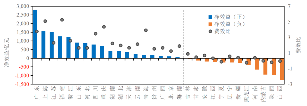 图5 全国30个省份《大气十条》实施五年期间净效益及费效比