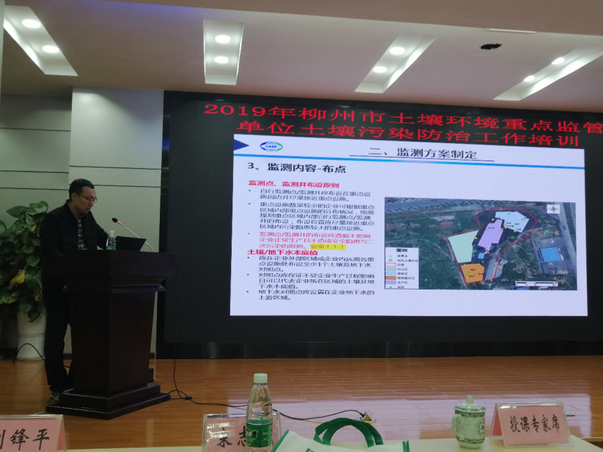 我院张岩坤助理研究员和郝占东工程师分别做了题为《重点监管企业土壤自行监测技术要求》、《企业拆除活动污染防治技术规定(试行)》的专题报告。张岩坤助理研究员主要从监测方案、布点采样、流转保存、检测报告编制等方面介绍了重点监管企业土壤和地下水监测的各项技术要求和主要经验,结合柳州市水文地质条件的特点提出了有针对性建议。郝占东工程师从编制背景、适用范围、原则要求、管理流程、技术要求共五个方面进行了授课,并对重点环节和重点问题进行了详细分析。通过授课,帮助重点监管企业更加规范和有效地开展土壤污染预防活动。