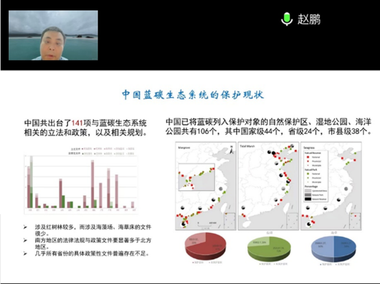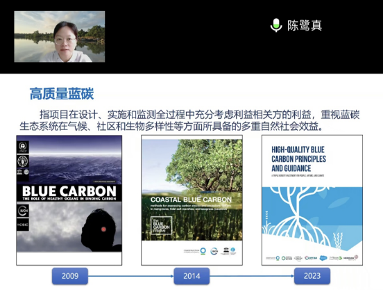 厦门大学环境与生态学院陈鹭真教授分享了红树林碳储量及增量的监测和评估内容,重点阐述了红树林碳汇监测方法、监测技术、监测设备、监测标准和评估方案,并就我国蓝碳交易方法研究进展和红树林生态养殖与蓝碳产业发展模式提出了见解。
